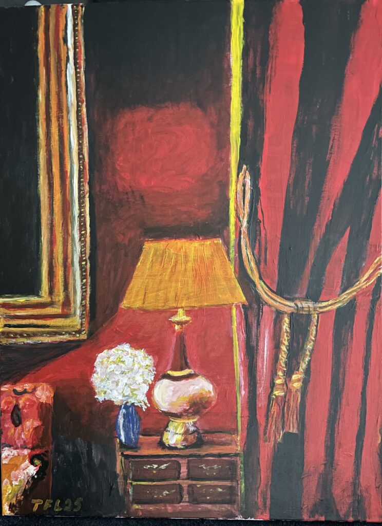 60×80 – Akryl på lærred – Den røde stue – 4.000