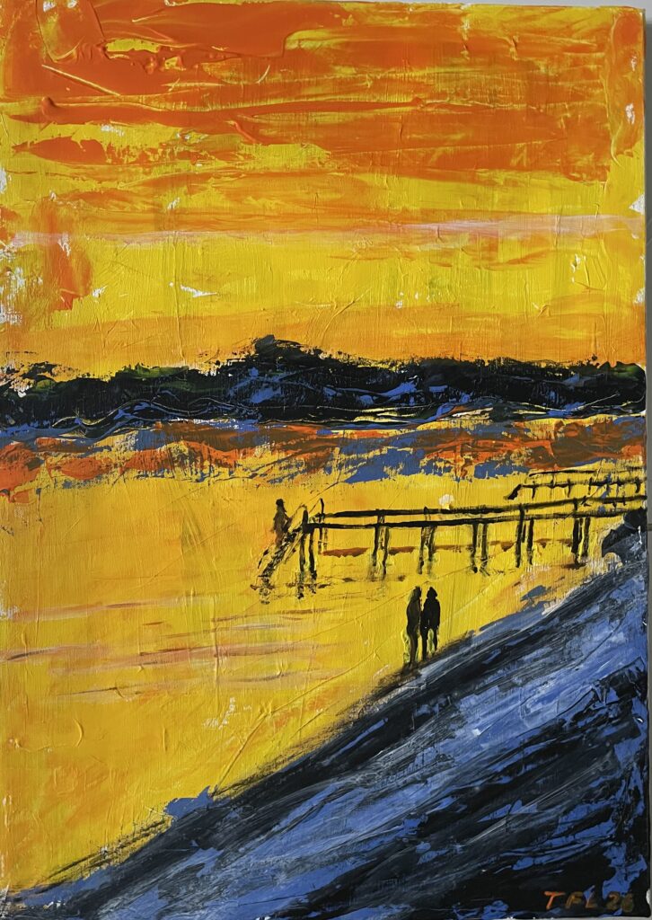 30×40 – Akryl på papir – Solnedgang ved badebroen – 1.500